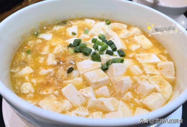 【蟹黄豆腐】食材:豆腐适量,蟹黄酱少许,葱末,姜末,盐少许,花生油少许。